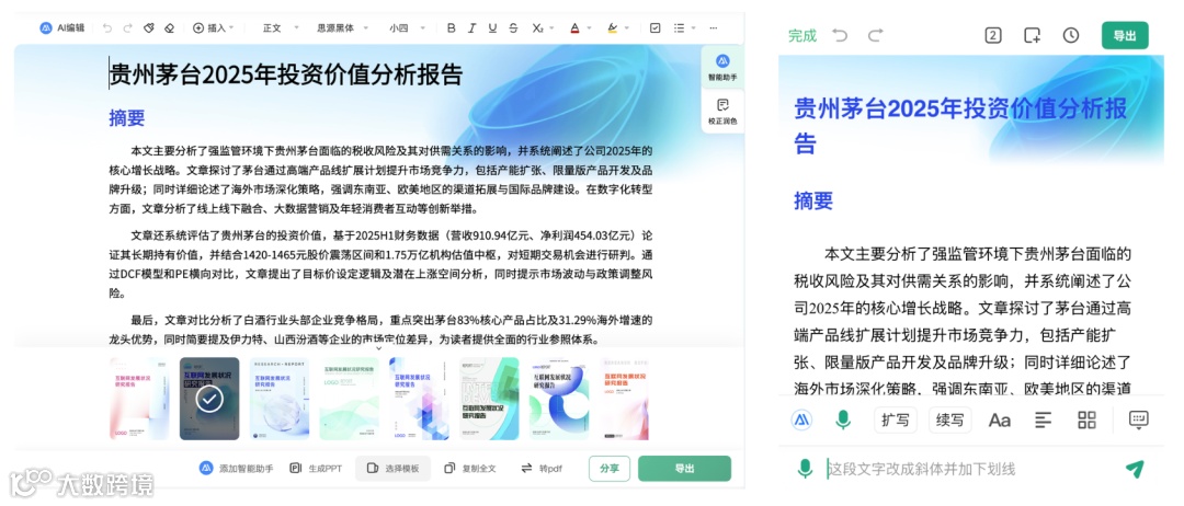 对于从业者而言,报告格式本身或许并不复杂,但在传统的操作路径中,往往是 AI 生成文本后,用户需要将内容复制粘贴到文档中,再花费数小时调整格式,耗时又耗力。而 GenFlow2.0 直接跳过了这些中间环节,短短几分钟,用户拿到的就是 60 页的成品报告,而非零散的素材。值得一提的是,GenFlow2.0 产出的分析报告虽为 Word 格式,却能直接导出为 PDF,用户在 PC 端和移动端都能完成内容和格式的任意编辑,相当于在应用内闭环了 Office 的功能。甚至连推荐输入都是 “这段文字改成斜体并加下划线” 这样的格式修订指令,GenFlow2.0 这次确实把产品闭环做到了极致。
