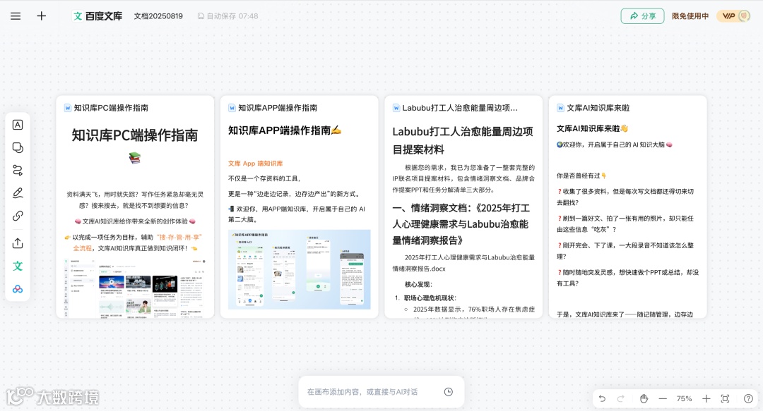 此外,文库与网盘的协同让 GenFlow2.0 拥有了 “记忆系统”,二者共同构成了更完善的平台生态。用户存储在知识库中的产品提案、项目材料等,都能成为 AI 的专属语料。例如,在撰写新的 Labubu 合作方案时,用户可以随时调用过往的 IP 案例和设计规范,AI 会基于这些历史资料生成更贴合用户需求和风格的方案,避免了重复劳动,也让内容更具连贯性和一致性。GenFlow2.0 Web 端与自由画布打通后,用户还能进行自由编辑,进一步提升了创作的灵活性。