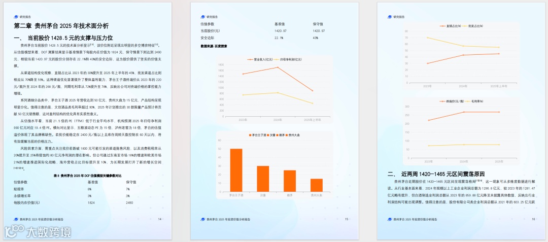 使用 GenFlow2.0 时,最直观的感受便是其专业的 AI 交付物,往往还没仔细研读内容,就会被交付格式所惊艳。第一次用 GenFlow2.0 生成贵州茅台投资分析报告时,屏幕上呈现的是一份完整得可以直接拿来使用的咨询报告。蓝色渐变的封面、自动生成的三级目录、精准嵌入在对应位置的数据图表,还有规范的首行缩进和加粗的标题,每一个细节都严格契合部分咨询机构发布报告的规范。这种对格式细节的极致追求,让 GenFlow2.0 生成的报告从视觉上就能传递出强烈的专业感。