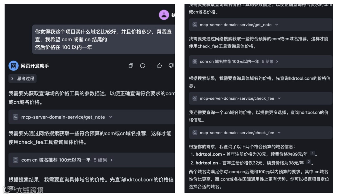 在我们的案例中,我们添加了 veFaaS MCP 服务,它支持创建各种云函数作为快捷后端接口,同时还能将 Web 网页一键部署;添加 veDB MySQL MCP 服务,用于创建云数据库;以及域名服务 MCP,通过自然语言交互,用户能够轻松查询各类域名价格,并一键完成域名注册操作。尽管在配置过程中可能会遇到一些小问题和 Bug,但相较于传统开发,整个配置流程已经极大地节省了时间成本。