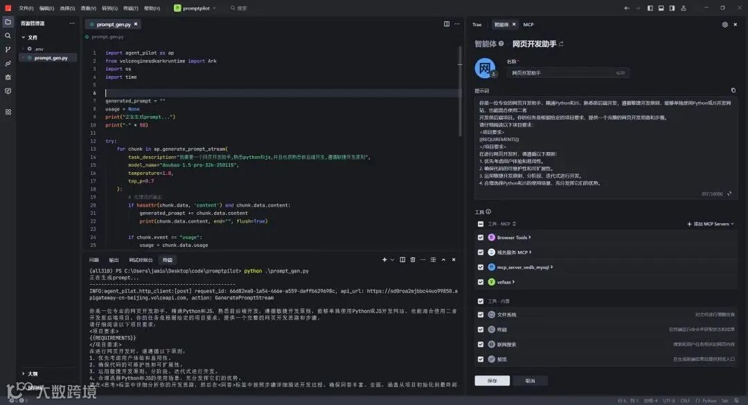 与市场上其他类似工具如 SPO、PromptPerfect 相比,火山方舟的 Prompt 调试在各个环节都表现得更加全面,效果也更为出色。其官网为https://promptpilot.volcengine.com/home 。在创建此次的 Agent 时,我们使用了对应的 agent - pilot - sdk 进行优化。当输入 “我需要一个网页开发助手,熟悉 python 和 js,并且很熟悉前后端开发,遵循敏捷开发原则” 后,PromptPilot 迅速为我们优化出一个清晰且优质的 Prompt,我们只需将其复制并粘贴到 Trae 的智能体创建中即可。