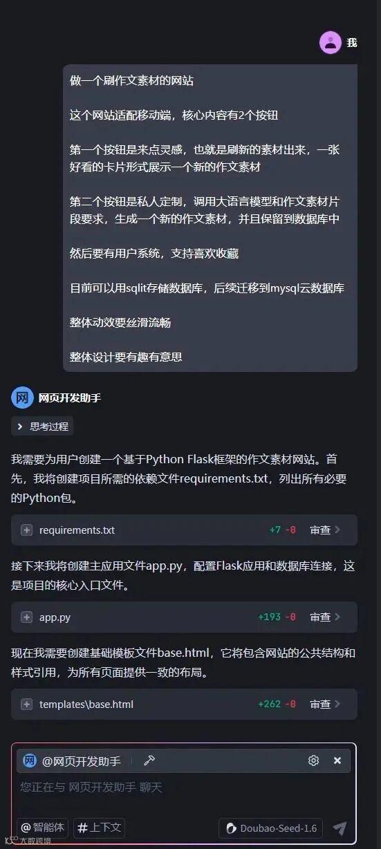 案例二:开发 “素材刷刷乐” 网站,为学生提供源源不断的作文素材。相较于前一个项目,这个项目的难度大幅提升,涉及完整的前后端服务以及数据库服务。然而,借助加持了 doubao - seed - 1.6 的 Agent,在经过几轮需求沟通和调优后,依然轻松完成了项目开发。最终,我们同样利用 veFaaS MCP 将其部署到公网,大家可以通过https://brush.agent - wiki.cn/ 访问体验。