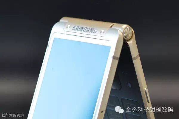 屏幕上方,三星的LOGO微微突起,金色镜面材质填充,两旁有两个铆钉,非常精致。