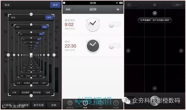 截屏功能、闹钟、水平拍摄时会显示方向的相机
