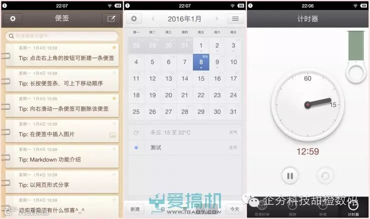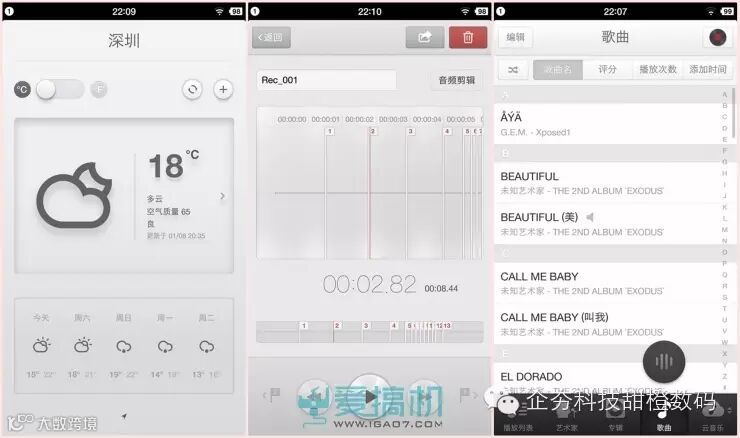 一页看完的天气app、可以打点记录的录音机、界面传统的音乐播放器