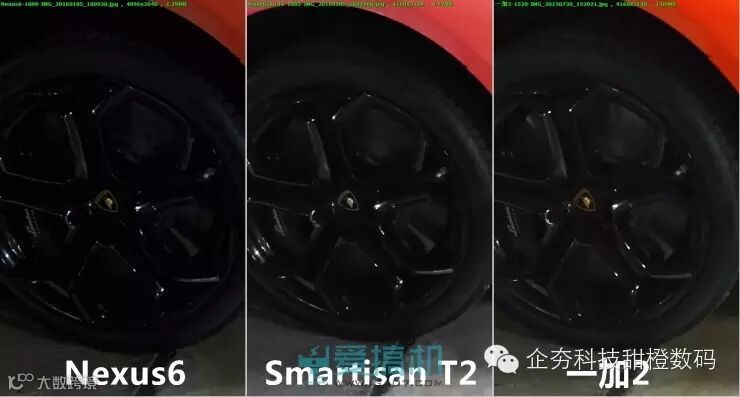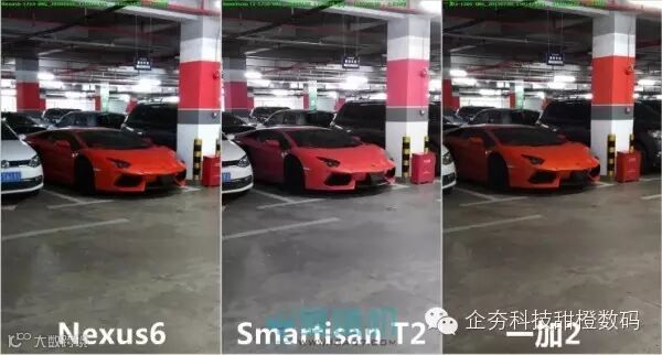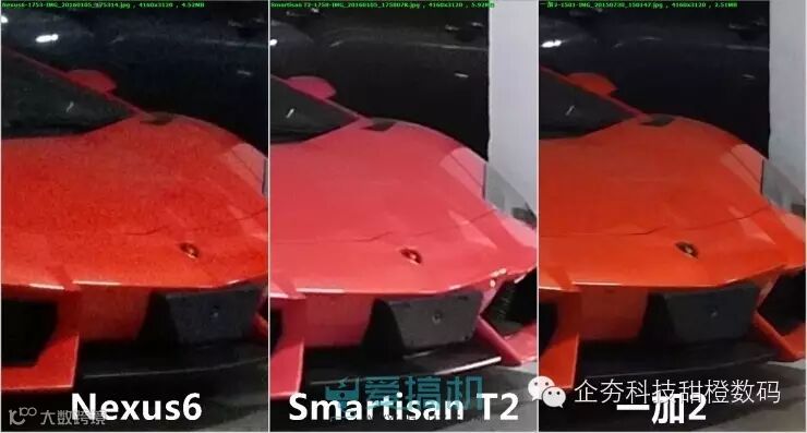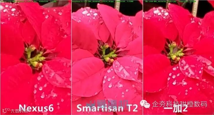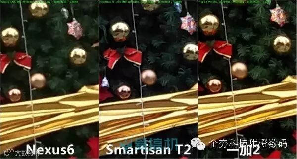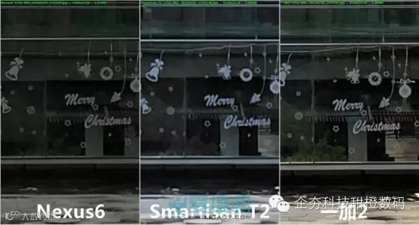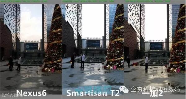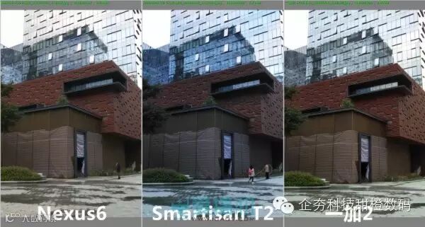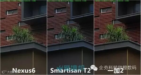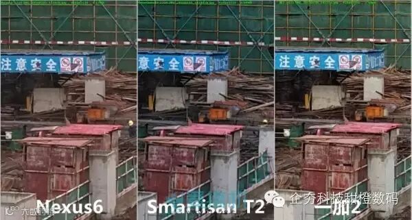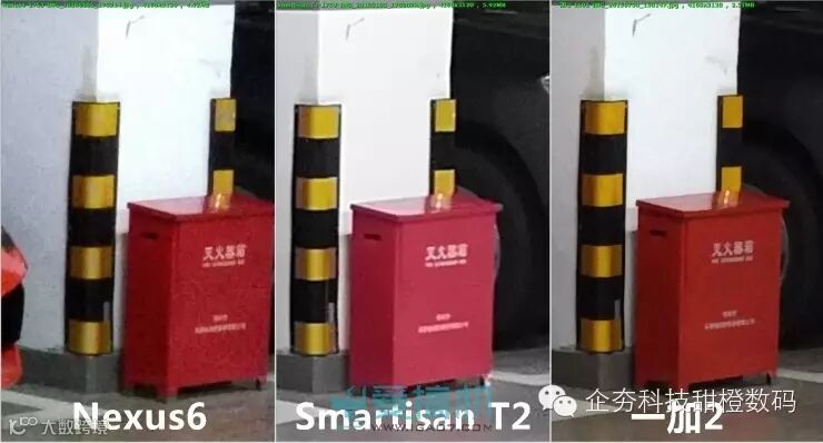 对比对象:采用上一年的旗舰Nexus6和今年的国产旗舰一加2进行对比,前者是光学防抖IMX214(很可能和T2同款);后者是同为1300万像素的OV 13860,感光器面积1/2.6英寸,单像素尺寸1.3μm。