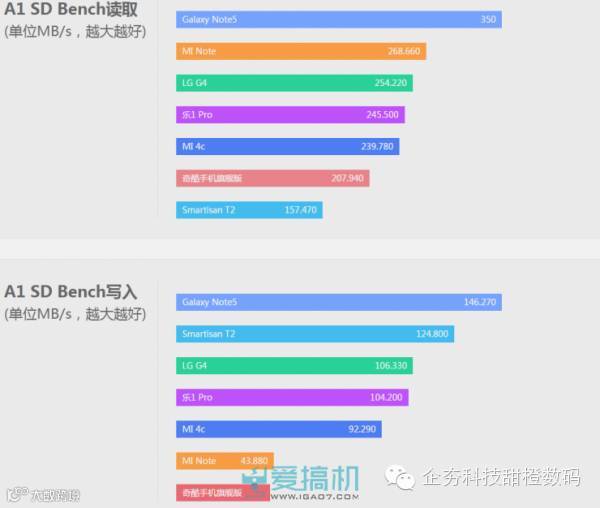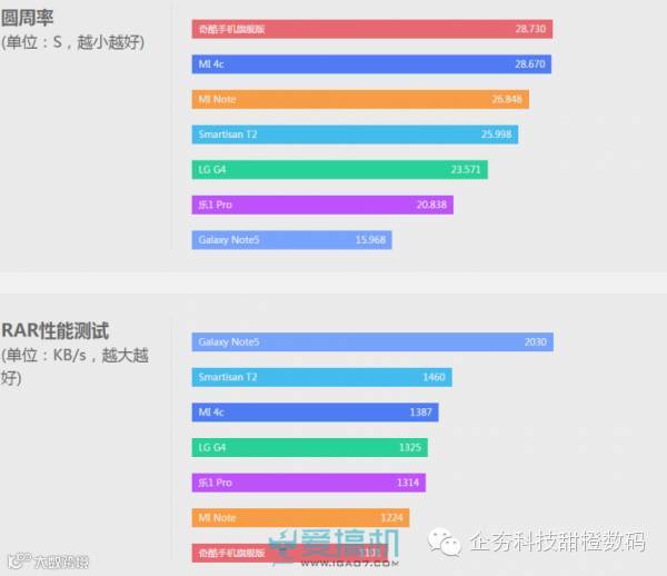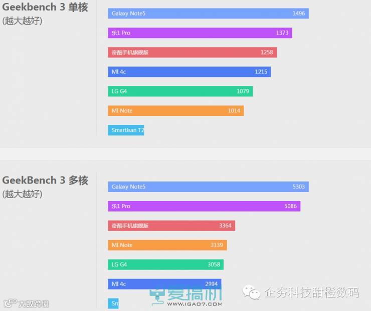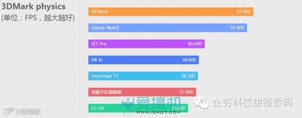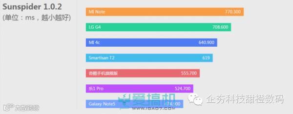使用同样搭载骁龙808的奇酷手机旗舰版、小米4c、LG G4,以及搭载Exynos7420的Note5、搭载骁龙810的乐视手机1 Pro、搭载骁龙801的小米Note作为性能对比: