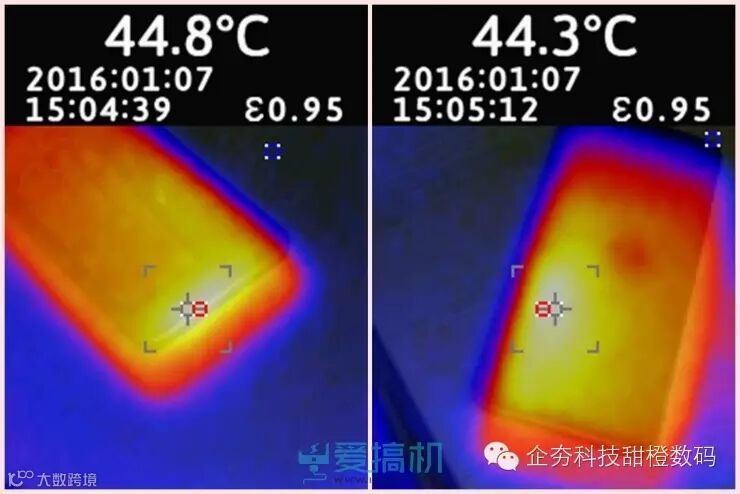 运行NBA2K15半小时后,正面最高温出现在三个实体键左侧,为44.8度;背面最高温出现在音量下键附近,为44.3度。虽然玻璃和金属材质传热较快,实际感受是温手和烫手之间,但温度控制已经算挺好了。