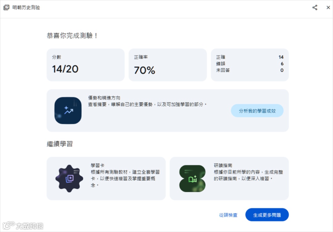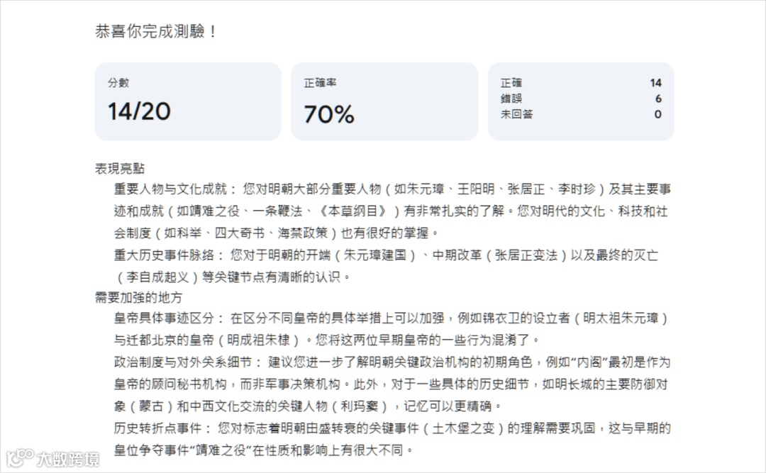 Google 2024 年 9 月升级的 Gemini(网址https://gemini.google.com/)是唯一能与 ChatGPT 抗衡的大模型,其学习功能核心优势是 “全面性”,整合 “quiz 测试”“引导式学习”“知识卡片复习”,覆盖 “学习 - 测试 - 复盘 - 巩固” 全链条,适合高中生备考、职场人学专业技能。Gemini quiz 与 quizGPT 的核心差异在 “反馈深度” 与 “场景适配”,两种用法均支持多格式输出:直接出题需明确 “学习目标 + 题型 + 重点”(如 “针对初中化学光合作用出 12 道题,含 3 选择 + 5 简答 + 4 实验分析,重点考光反应与暗反应区别”),题目附带解析与易错点提醒(如光合作用实验 “黑暗处理目的” 标注 “耗尽淀粉避免干扰”),且能自动降难度(连续错 2 题则推送光反应示意图);基于报告出题可避免 “学测脱节”,先让 Gemini 生成深度报告(如《2024 中国 AI 产业报告》),再点击 “测验” 生成对应题目(如 “2024 年 AI 医疗应用率 45%,占比最高的场景是?”),互联网产品经理刘女士反馈 “1 小时掌握报告核心,还能发现漏看的‘AI 教育渗透率’重点”。其 “复盘体系” 更是亮点:即时错题解析含 “知识点链接”(答错光合作用场所可看叶绿体结构动画)、结算界面生成 “掌握雷达图”(用绿黄红标注光反应、暗反应、实验设计的掌握程度)、自动生成可翻转学习卡(如东风 - 41 导弹卡片含射程、制导方式及发射示意图)。