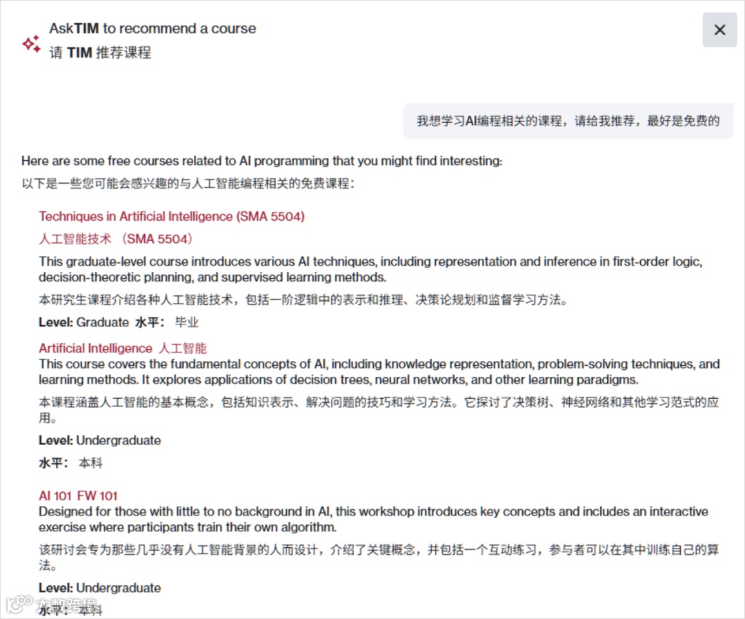 截至 2024 年 11 月,平台全球用户超 800 万,中国用户占 12%(约 96 万),985 高校计算机学生小张说 “考研参考书是 MIT《人工智能导论》,平台课程帮我提前预习,比二手笔记靠谱”。为解决 “无人答疑”,MIT 配备 AI 助教 Ask TIM(MIT 反向拼写,河狸形象),支持 10 种语言,核心功能包括:个性化课程推荐(零基础学量子力学,推荐 “基础物理→量子导论→新能源材料”,附学习时长与难度),若不知基础则生成 10 道前置题(如测量子力学前考波粒二象性),按正确率推荐课程;知识答疑与步骤解析(问二叉树遍历区别,会用定义、实例、应用场景解答,计算题分步标注公式来源);学习计划梳理(每天学 2 小时,1 个月学完《Python 编程基础》,自动调整进度避免落后)。Ask TIM 目前有局限:不能实时陪伴(需暂停视频回课程页提问)、复杂问题解答浅(如薛定谔猫悖论不引用 2024 最新论文),但 MIT 计划 2025 年升级 “实时视频交互” 与 “学术资源链接” 功能,提升实用性。