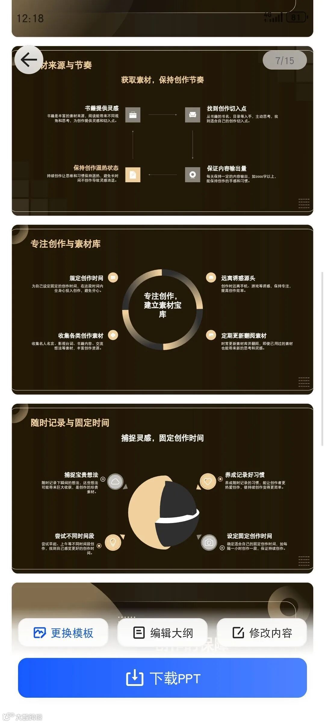 夸克 PPT 的移动端应急功能实用性强。当用户处于外出状态且无电脑设备时,通过手机夸克 APP 生成 PPT 后,可直接在移动端完成编辑 —— 支持文字点击修改、图表数据点选更新,甚至可通过拍摄手写笔记,由系统自动识别文字并插入 PPT。测试中故意输入错误表述 “转化路”,系统会弹出纠错提示:“是否修正为‘转化率’?”,对操作失误的容错性较高。