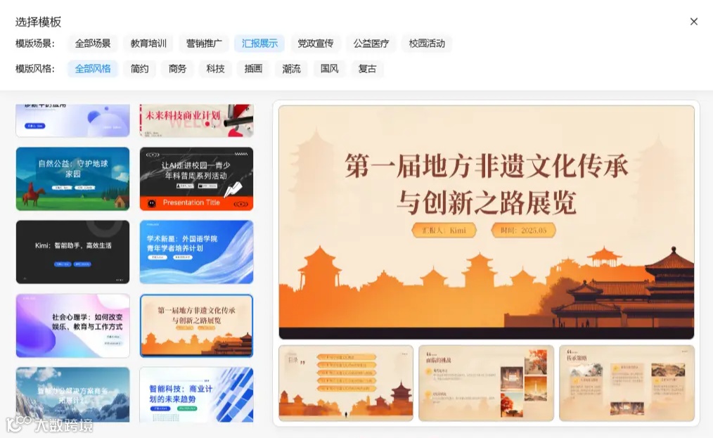 汇报需侧重数据分析与逻辑阐述:推荐选择 Kimi PPT。建议先通过该工具生成内容框架与核心文案,再搭配美观模板进行优化 —— 虽操作步骤较多,但可降低汇报中的沟通风险。