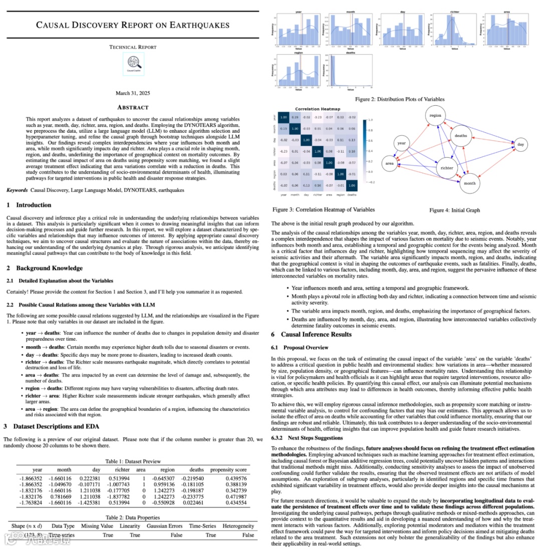 实际应用案例进一步验证了 Causal-Copilot 的价值。当用户提交地震时序数据集的分析请求时,系统自动启动时序数据处理流程:预处理模块首先检测数据中的缺失值并进行插补,提取时间序列特征;算法选择模块根据时序数据特性,调用动态贝叶斯网络等适合的因果发现算法,构建地震相关变量的因果图;后处理模块通过多次.bootstrap 验证因果连接的稳定性,利用大语言模型分析因果逻辑是否符合地质科学常识;最终生成的报告不仅包含可视化的因果图,还详细解释了各变量间的影响强度和不确定性,为地震预测研究提供了科学依据。