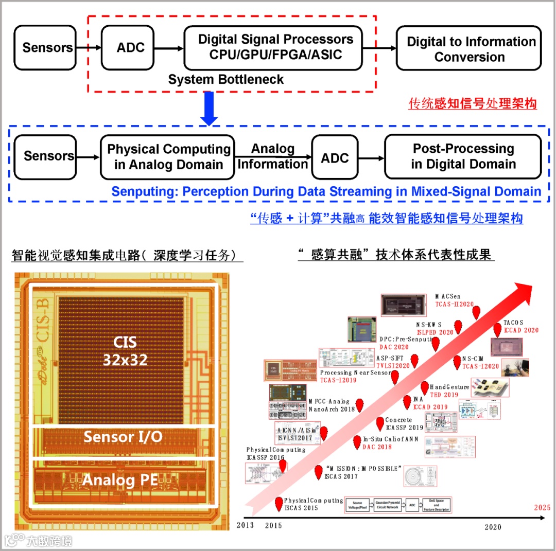 后摩尔时代(Post-Moore Era)的⾼能效智能感知信号处理架构研究提出了“传感 + 计算”共融(Senputing: Sensing with Computing)的新型智能感知计算范式;⽀持将多种类型传感器(视觉、听觉和触觉等多模态)与智能信号处理任务深度融合,采⽤“模拟-信息”转换⽅式的“物理计算”技术和近似计算技术,通过算法和集成硬件的联合设计优化,设计并实现⾯向视觉、听觉和触觉感知等多模态智能感知应⽤的超低功耗集成电路芯⽚,满⾜机器⼈、穿戴式和物联⽹等智能机器感知场景对微型化、智能化和⾼能效的苛刻要求。