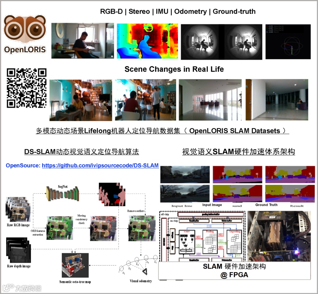 智能服务型机器⼈(Intelligent Service Robots)需要移动机器⼈系统通过多模态智能感知处理能⼒,提取环境动态语义信息,以适应⻓期的和场景变化的定位导航等应⽤需求。完成包括数据集采集发布,SLAM算法设计和硬件加速平台设计的完整研究体系:(1)合作采集多种动态场景的定位导航数据集(OpenLORIS: a Lifelong SLAM Datasets),以体现环境/⽬标变化、拓扑变化和知识遗忘等特性;(2)通过视觉语义融合等技术,设计适⽤于Lifelong⻓期动态场景的SLAM算法和系统;(3)设计和实现⾼能效的SLAM硬件体系架构以满⾜实时和动态适应的智能服务型机器⼈定位导航需求。