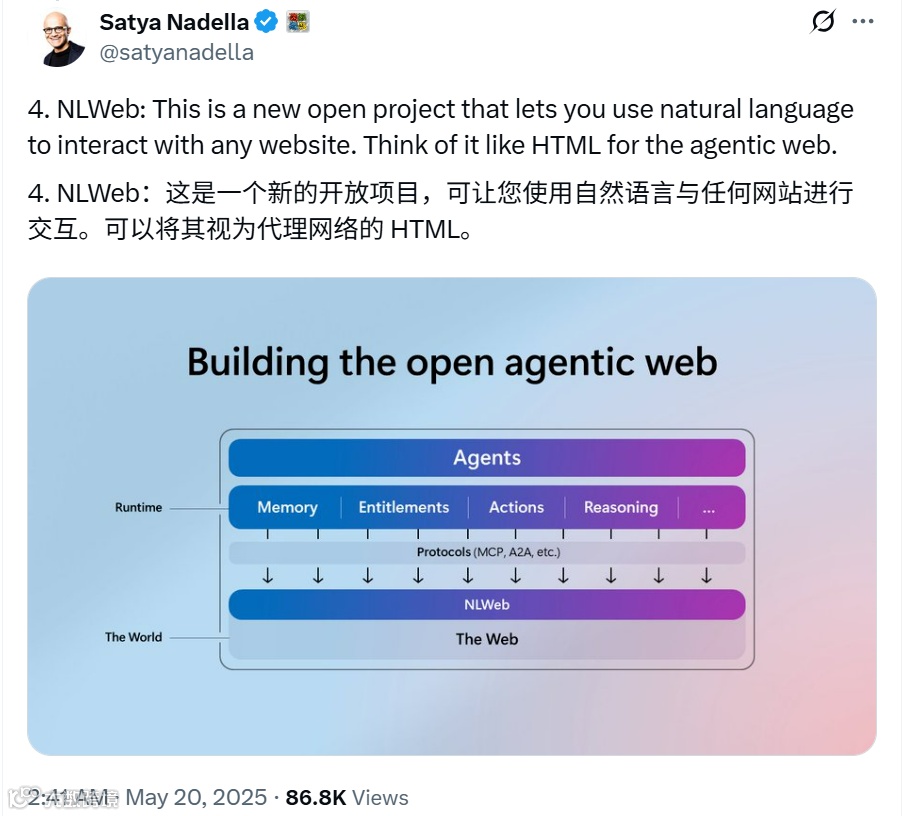 在微软Build 2025开发者大会的热潮中,一个名为NLWeb(Natural Language Web)的开源项目成为全球技术社区的焦点。这项由微软推出的创新计划,正以突破性的姿态重新定义人类与互联网的交互边界——它致力于让任何网站都能轻松搭载自然语言交互界面,将传统的信息展示平台转化为具备人工智能能力的智能应用生态。微软CEO萨提亚·纳德拉将其喻为“智能体化web世界的HTML”,这一比喻深刻揭示了NLWeb在未来互联网架构中的基础地位:它试图构建一套让人类与智能体无缝对话的“AI Web”底层协议,如同HTML革新文档共享模式那样,重塑整个网络的交互逻辑。