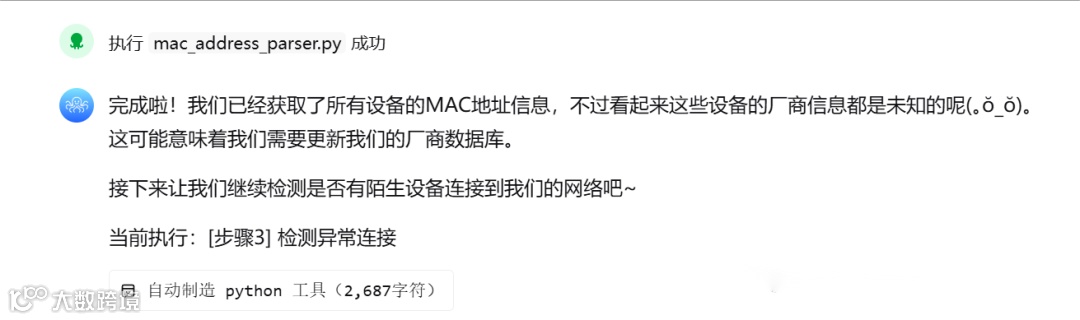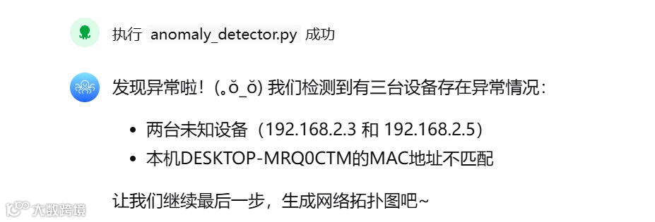 为验证 AiPy 应对真实复杂任务的能力,我们模拟了一个贴近生活的场景 —— 排查家庭 Wi-Fi 异常延迟,揪出潜在 “蹭网贼”。整个过程凸显其任务拆解、执行监控与自主修复的智能性。安装与配置极简启动,图形化 / 命令行任选,访问官网下载对应系统安装包(小白友好)或通过 pip install aipyapp 一键部署(极客向),轻量配置仅需 API 密钥,在工作目录 aipy.toml 文件中填入所选 LLM 模型(如 DeepSeek)的 API Key 即可启动,无需复杂环境搭建。自然语言下达复杂安全审计指令,用户指令为 “我家 Wi-Fi 最近速度不稳定,图片加载缓慢,帮我检测局域网是否有异常设备接入,生成网络拓扑图并识别潜在威胁。”AiPy 迅速响应,将任务拆解为清晰四步计划:扫描局域网设备以获取所有连接 IP/MAC 地址列表,解析 MAC 地址和厂商信息通过 OUI 数据库匹配设备合法性,检测异常连接识别非信任设备或高频数据传输行为,生成网络拓扑图直观呈现网络结构与可疑节点。任务执行过程和效果中,列出计划后开始继续执行,很快发来报告坦诚指出小问题,不过插曲未多影响,标记问题后继续执行核心任务异常检测,并很快发现异常,让人意外的是真识别出异常,虽在尝试执行最后一步时终端弹出失败消息,但 AiPy 没有崩溃退出,而是发现失败并诊断原因(缺少 networkx 库),立刻提出解决方案安装它,甚至未询问就给出行动计划,自动执行安装命令成功安装 networtx 库后再次尝试生成拓扑图,一切顺利,最后给出详尽总结报告,虽说展示不够精美高大上,但胜在一目了然,最终果断拉黑异常设备,家中所有 IoT 设备运行正常,无误杀。
