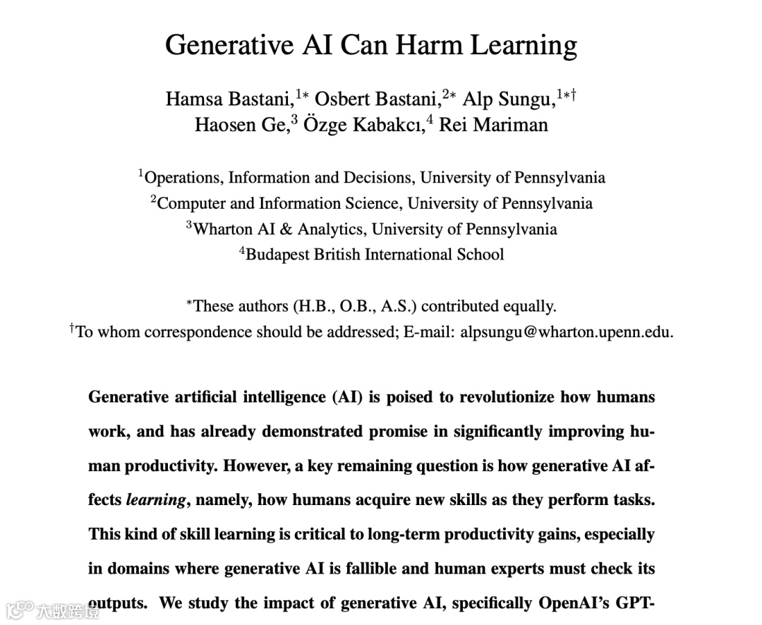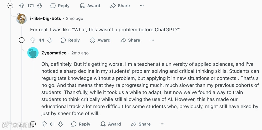 宾夕法尼亚大学的实验揭示了一个吊诡现象:允许自由使用 AI 的学生在练习阶段表现优异,但若剥离技术辅助,其真实水平竟比完全不用 AI 的学生低 17%。这种 "临时抱佛脚" 式的技术依赖,正在重塑学习的本质 —— 当解题过程被 AI 对话窗口中的即时反馈替代,学生失去的不仅是独立思考的机会,更是知识内化的关键过程。就像依赖计算器的孩子终将遗忘心算逻辑,过度使用 AI 正在制造 "认知幻觉":漂亮的作业背后,是底层概念理解的空洞。认知科学研究显示,人类大脑的神经突触连接,正是在反复试错、深度思考的 "认知挣扎" 中得以强化。卡内基梅隆大学的研究指出,不当使用 AI 导致的 "认知卸载",会使本该由大脑完成的信息处理过程被外包给技术系统,长此以往可能造成批判性思维能力的结构性退化。这种影响在青少年群体中尤为显著,当他们习惯于向 AI 索要答案而非自主探索,思维肌肉便因缺乏锻炼而逐渐萎缩。