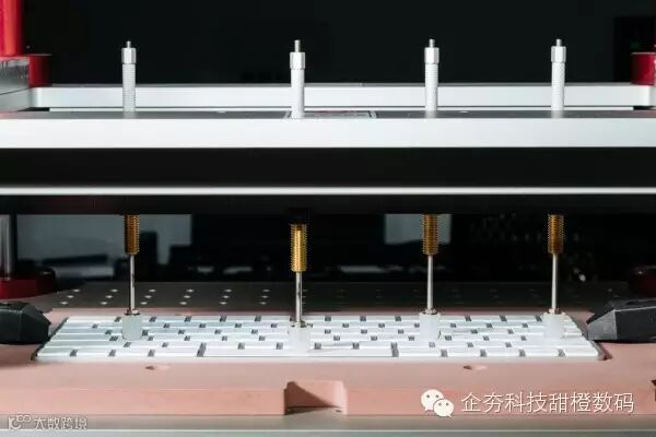 上面这台机器有一个轻击锤——看着有点像修眼镜用的小螺丝刀——它在每一个键帽上碰戳多次。Bergeron 说:“我们现在出货的每一个键盘都要测试5个不同的点,四个角和中间位置。”