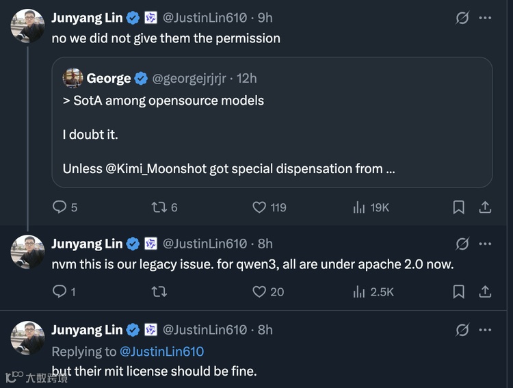 面对社区的询问,Qwen 团队负责人林俊旸在 X 平台上最初回复称 “no we did not give them the permission”(不,我们没有给他们授权),这一回复瞬间引发了激烈的讨论。然而,仅仅一个多小时后,林俊旸发布了第二条推文,改变了事件的走向:“nvm this is our legacy issue. for qwen3, all are under apache 2.0 now.”(没事了,这是我们的历史遗留问题。对于 qwen3,现在所有模型都采用 apache 2.0 协议了)。