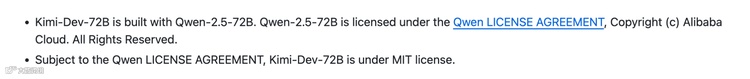 在许可证方面,Kimi-Dev-72B 的 LICENSE.md 文件显示其采用 MIT 协议发布。然而,月之暗面也在文档中明确说明:“Kimi-Dev-72B is built with Qwen-2.5-72B. Qwen-2.5-72B is licensed under the Qwen LICENSE AGREEMENT, Copyright (c) Alibaba Cloud. All Rights Reserved. Subject to the Qwen LICENSE AGREEMENT, Kimi-Dev-72B is under MIT license”。这意味着 Kimi-Dev-72B 需要遵守 Qwen-2.5-72B 的原始许可限制,同时将自己通过强化学习获得的微调权重等创新工作以 MIT 协议开源,这种 “delta 权重” 发布的方式在开源社区中并不罕见,它既尊重了基础模型的版权,又为自身的创新成果找到了合适的开源途径。