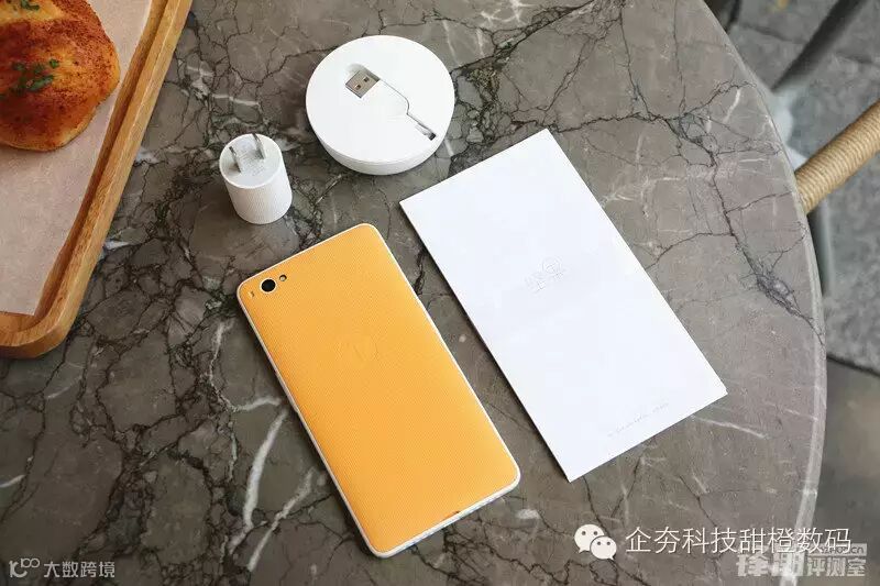 打开包装后一台坚果U1和配件映入眼帘。如同目前大部分千元机一样,坚果U1仅配置了充电头、数据线、质保证明和说明书,圆柱形设计的充电头表层采用与坚果U1后盖同样的立体纹理设计。但如目前大部分国产手机一样,盒内并没有配备耳机。