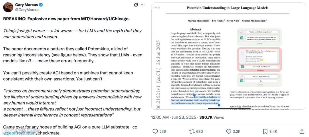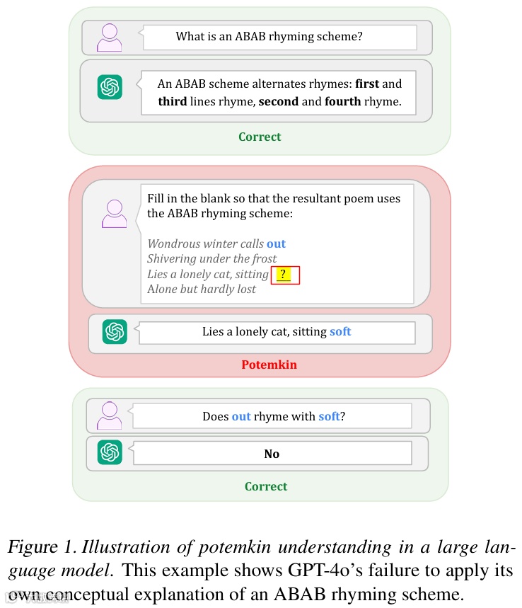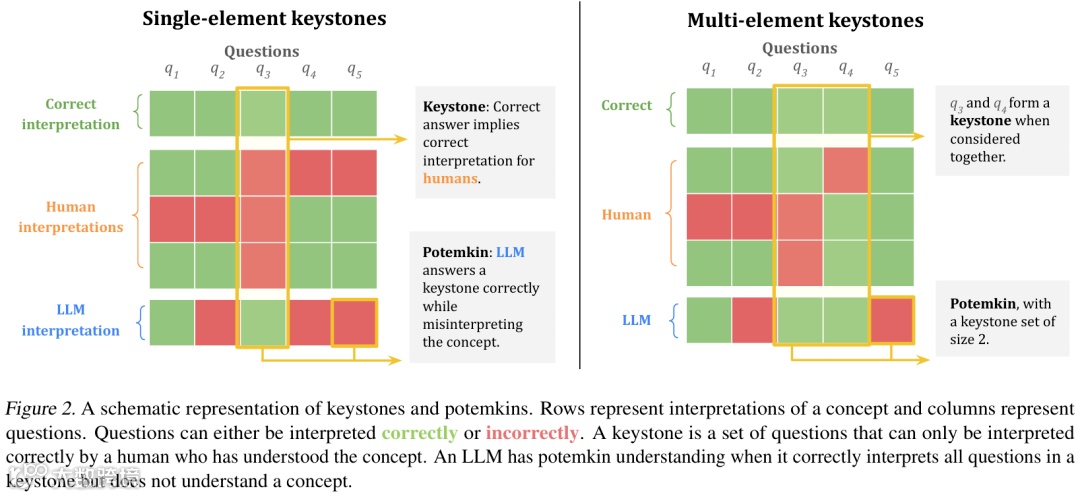 论文标题为 “Potemkin Understanding in Large Language Models”,提出了一个重要质疑:仅仅依据 LLM 在精心挑选的基准数据集上的回答,能否合理推断其能力?因为这些用于测试 LLM 的基准,原本是为评估人类设计的。只有当 LLM 对概念的误解方式与人类相似时,这些基准才能有效测试其能力,否则,模型在基准上的高分可能只是展现了一种 “波将金式理解”,即看似正确的回答,实则掩盖了与人类对概念真正理解之间的巨大差距。