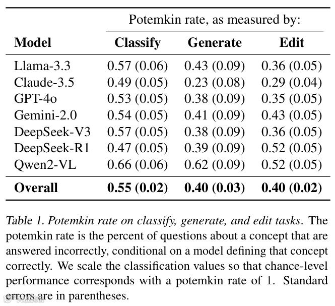 论文构建了一个涵盖上述三个领域、涉及 32 个概念、共收集 3159 条标注数据的数据集。通过对 7 个因流行度及涵盖不同开发商和规模而被选中的大型语言模型进行分析,研究团队发现,即使模型能够正确定义一个概念,在分类、生成和编辑等需要应用概念的任务中,往往也无法准确执行。研究团队测量了模型的波将金率,即模型在基石示例上做出正确回答的前提下,在随后问题上回答错误的比例(对于随机准确率为 0.50 的任务,将该值乘以 2,波将金率为 1 表示表现相当于随机水平)。结果显示,在所有模型和领域中,波将金率普遍较高。虽然模型在 94.2% 的情况下能正确定义概念,但在执行任务时表现急剧下降,这表明波将金现象在研究分析的所有模型、概念和领域中无处不在。