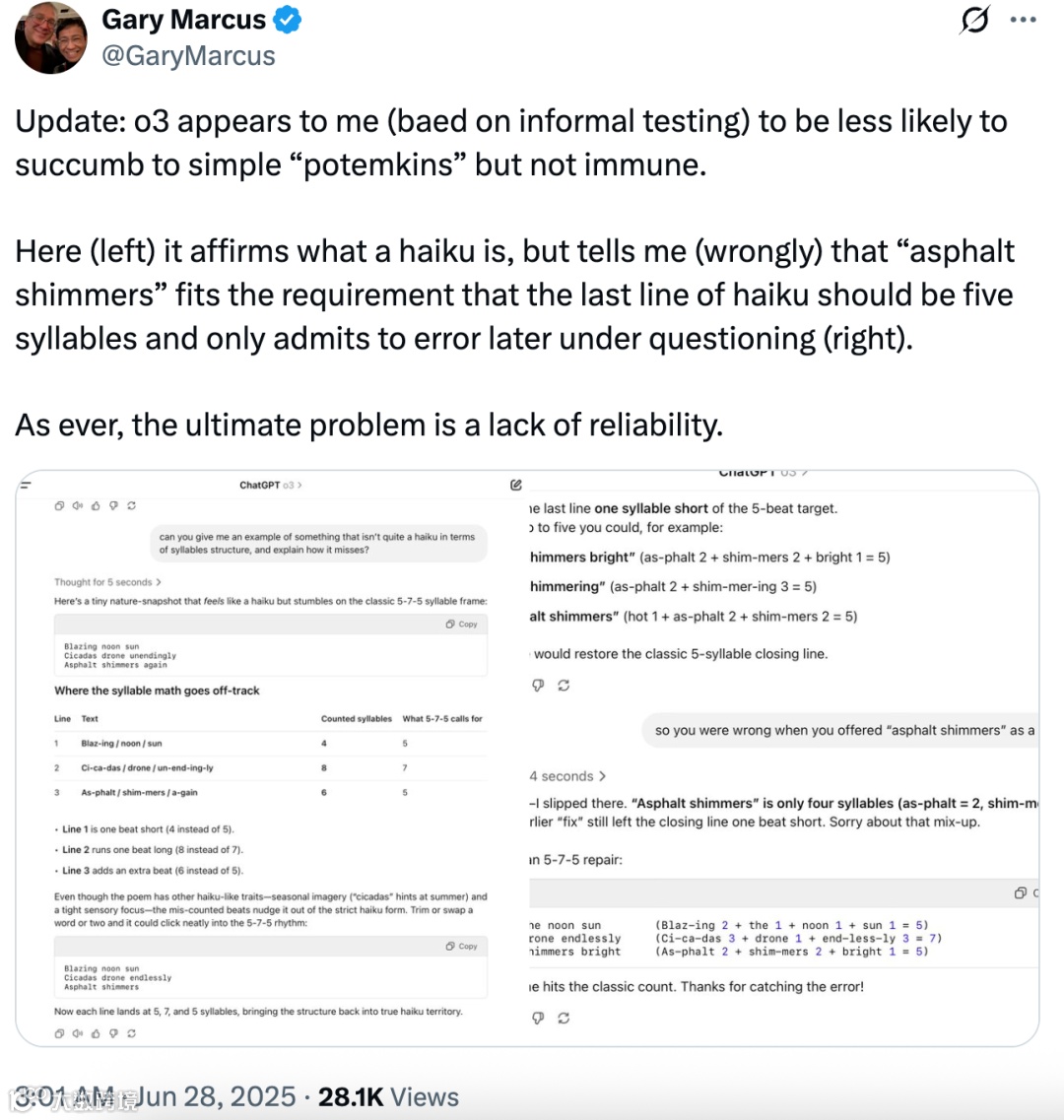 Gary Marcus 在仔细研读论文后,认为其核心观点正确,即 LLM 确实容易产生各种自相矛盾,如 “波将金式错误”。但他觉得论文中的具体实验例子说服力不够强。基于自己之前的非正式实验观察(包括下周将公布的一个例子),他确信存在真正的问题,但要弄清楚问题的普遍性及对不同类型模型的影响程度,还需更深入研究。他还指出,像 o3 这类模型似乎较不容易陷入简单的 “波将金式错误”,但并非完全免疫。例如模型能正确阐述俳句的定义,却错误断言 “asphalt shimmers” 符合俳句末行应为五音节的要求,直到后续追问才勉强承认错误,这再次印证了模型缺乏可靠性的根本缺陷。