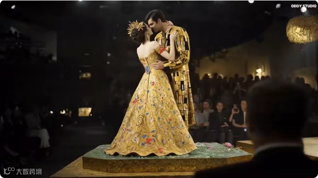 随着秀场灯光的变幻,更多令人惊叹的艺术名场面接连上演。维纳斯从巨大而奇幻的扇贝贝壳中缓缓诞生,柔美的身姿散发着圣洁的光芒,宛如降临人间的天使,让全场观众瞬间屏息凝神,沉浸在这份超凡脱俗的美感之中。克里姆特的《吻》被 AI 技术神还原,男女模特彼此深情相拥,镜头 360 度缓缓回旋,将画中极致的浪漫与浓烈的情感毫无保留地展现在观众面前,每一个细节都细腻入微,仿佛能让人触摸到爱情的温度。