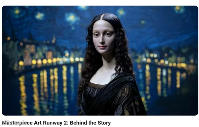 走进这场梦幻般的万人 T 台秀场,仿佛踏入了一个打破时空桎梏的艺术秘境。夜幕低垂,繁星闪烁,梵高笔下那极具标志性的《星月夜》率先呈现在观众眼前。旋转的星云如同燃烧的火焰,在夜空中肆意舞动,释放着无尽的激情与浪漫。紧接着,蒙娜丽莎嘴角那神秘莫测的微笑,在星月夜的映衬下,更添几分朦胧的诗意,她优雅地站在河边,仿佛在诉说着跨越时空的故事。身着时装的戴珍珠耳环的少女,迈着轻盈的步伐款款而来,灵动的眼神和精致的妆容,将维米尔画作中的神韵完美复刻,让人不禁沉醉于她的温婉与灵动之中。