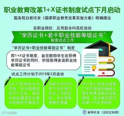 “职教20条”提出,从2019年开始,在职业院校、应用型本科高校启动“学历证书+若干职业技能等级证书”制度试点(以下称1+X证书制度试点)工作。试点工作要进一步发挥好学历证书作用,夯实学生可持续发展基础,鼓励职业院校学生在获得学历证书的同时,积极取得多类职业技能等级证书,提高就业创业本领,缓解结构性就业矛盾。