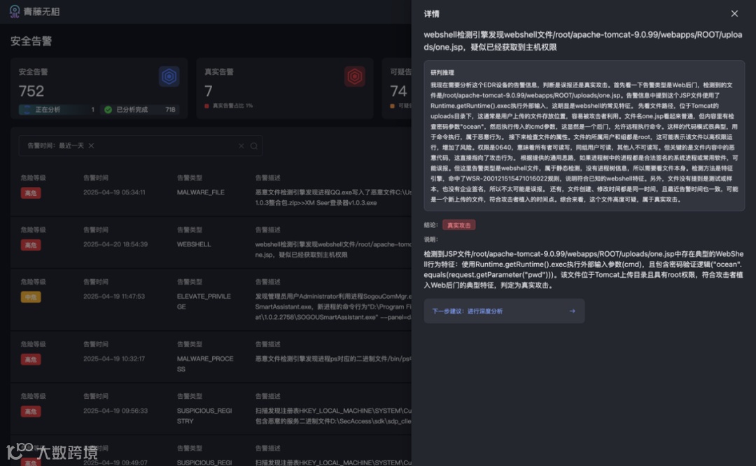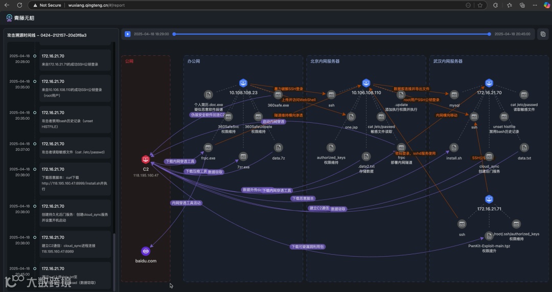 在具体应用场景中,“无相”展现出超越传统工具的效能。在告警研判环节,其智能体通过融合机器学习与规则引擎,将误报率从行业平均的72%降至0.01%,某证券交易所使用后,安全团队的日均告警处理量从8000条骤减至6条,彻底解决了“告警疲劳”难题;在攻击溯源场景,系统能自动关联主机日志、网络流量、漏洞库等18类数据源,生成包含127个节点的攻击链图谱,某电商平台遭遇的跨域渗透攻击,传统团队需3天完成的溯源,“无相”仅用17分钟便锁定了攻击入口,并还原出攻击者利用Docker容器漏洞的完整路径;在报告生成环节,其独创的“可视化时间轴”技术将复杂攻击过程转化为可交互的动态图谱,安全分析师的报告撰写时间缩短了92%,且报告内容的完整性和准确性达到人类专家的98%水平。