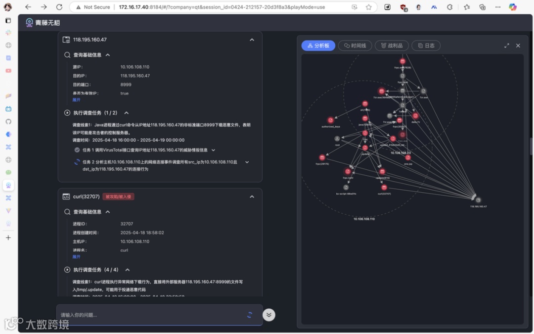 “无相”的核心突破在于引入“ReAct模式”(Act-Observe-Think-Act循环)与“Plan AI + Action AI双引擎架构”,确保复杂任务中的动态纠偏能力。当工具调用异常时,系统可自主切换备用方案而非中断流程,例如在APT攻击分析中,Plan AI作为“组织者”拆解任务目标,将调查过程细分为日志解析、威胁建模、横向移动追踪等子任务,Action AI作为“执行专家”并行调用多个工具链同步执行,二者基于实时共享的知识图谱实现信息交互,使复杂攻击的响应周期从“天级”压缩至“分钟级”。在某能源集团的实战演练中,“无相”对潜伏三个月的高级持续性威胁(APT)的识别与处置仅耗时117秒,较人工团队效率提升40倍。