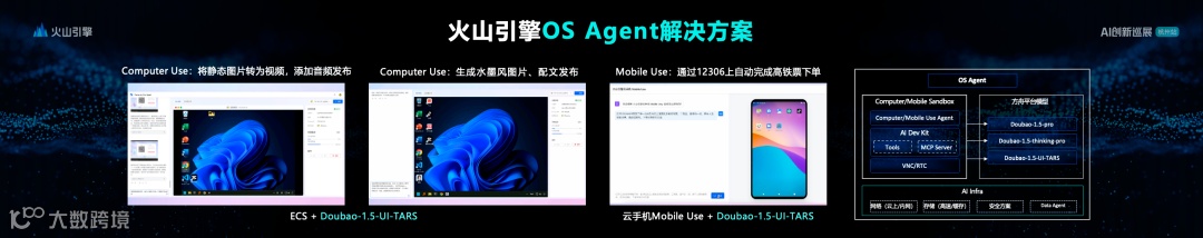 火山引擎的布局不止于模型本身,更着眼于构建大模型落地的完整生态。针对智能体开发难题,此次发布的OS Agent解决方案与GUI Agent模型「豆包1.5·UI-TARS」,突破了传统自动化工具依赖预设API的局限。UI-TARS通过屏幕视觉理解与界面元素操作的深度整合,实现了「无API依赖的智能交互」,在OS World测试集得分28分,成为国内领先的GUI Agent模型,可广泛应用于电脑与手机端的自动化任务处理。配套推出的AI云原生·ServingKit推理套件,则通过容器编排、推理观测等技术,帮助企业降低大规模模型部署的技术门槛与成本,实现高性能推理服务的快速落地。