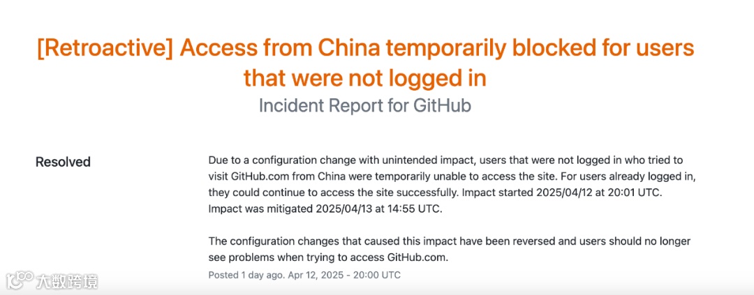 事件发生后,GitHub并未第一时间作出回应,直到4月13日晚间才发布声明,称此次访问异常是“配置更改错误”导致的意外影响。根据官方说明,问题始于4月12日20:01 UTC,修复于4月13日14:55 UTC,期间未登录用户的HTTPS访问被错误限制,而已登录用户的访问未受影响。GitHub强调,相关配置错误已被撤销,用户访问恢复正常。
