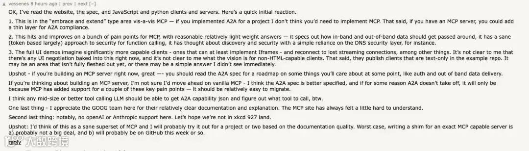 另一项竞品是思科牵头的AGNTCY协议,该协议侧重代理间的基础通信标准,而A2A则扩展了企业级所需的安全、任务管理和多模态支持。例如,AGNTCY定义了智能体消息的基本格式,而A2A在此基础上增加了任务优先级队列、异常处理机制和用户体验协商接口,更适合复杂业务流程。这种差异化定位使得A2A与现有协议形成互补,谷歌已与AGNTCY团队展开技术对接,探讨在基础通信层实现互通的可能性。