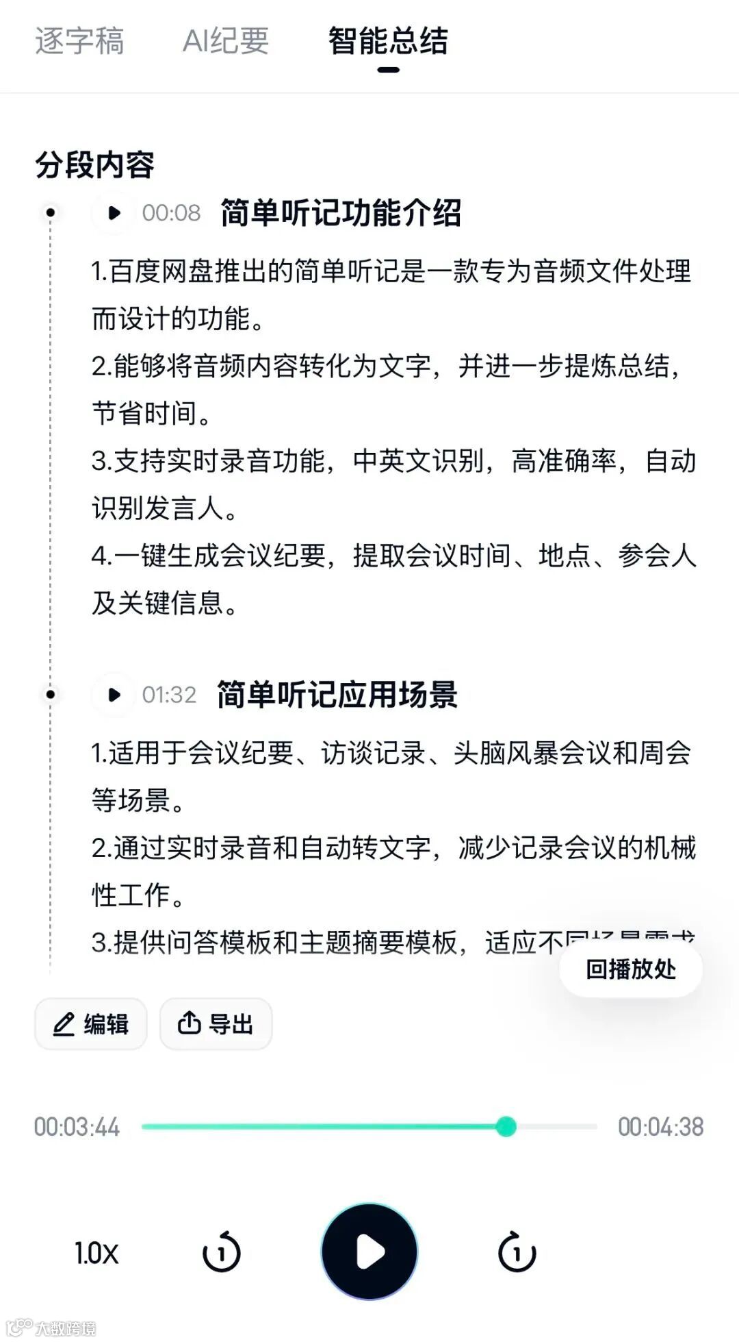 百度网盘「简单听记」搭载百度文心大模型的声纹识别技术,可在3秒内完成参会者声纹建模,实现98.7%的多角色语音分离准确率。即使在百人会议中,也能精准区分不同发言人,配合实时标注功能,让会议内容一目了然。采用Transformer架构的语言模型,可动态分析会议语境,智能过滤「嗯」「啊」等无效语气词,同时对专业术语进行智能标注。在金融行业实测中,对「资产证券化」「衍生品定价」等术语的识别准确率达到99.2%。基于NLP技术的智能摘要模块,能自动提炼会议中的决策点、行动项和数据指标。测试显示,其生成的会议纪要在关键信息完整度上超越85%的人工记录,且耗时从2小时压缩至5分钟。