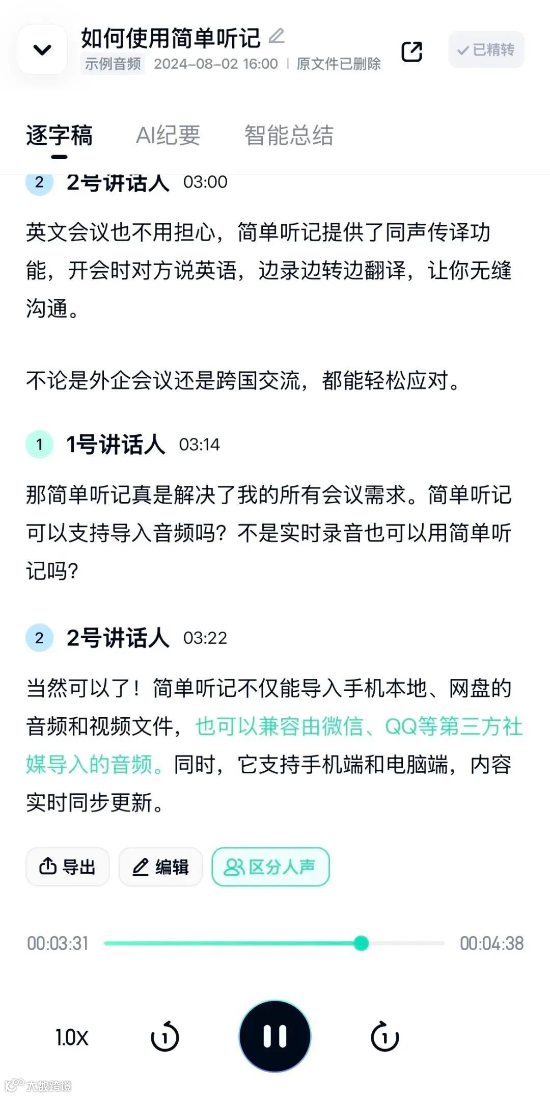 除了技术优势,简单听记在实际应用中的场景覆盖也非常广泛。在会议场景中,它支持10种语言、23种方言的实时转写,配合动态字幕生成,让跨国会议沟通无障碍。用户可在听记过程中插入标签、评论和重点标记,系统自动生成结构化会议记录。在培训场景中,通过AI分析培训内容,自动生成知识点图谱,支持关键词检索和关联内容推荐。系统还可分析学员提问频率、互动数据,生成个性化学习报告。在访谈场景中,通过语音情感识别技术,捕捉受访者的情绪变化,为后续分析提供数据支持。自动提取访谈中的金句片段,支持一键生成短视频素材。
