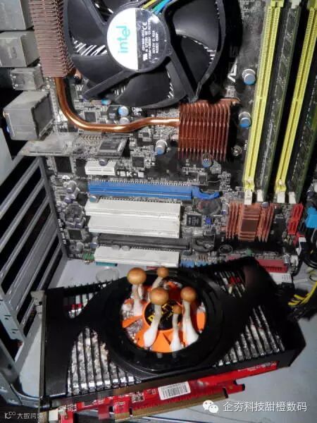 Reddit论坛一位用户分享了显卡长出蘑菇的照片。他表示,自己这台电脑一个月没有使用,在按下电源按钮之后,电脑无法启动,他打开机箱,才发现自己的显卡已经长出蘑菇。一位Reddit论坛的认证科学家对此的看法是,这种蘑菇似乎是霜霉菌长出的裸盖菇,俗称爆炸蘑菇。