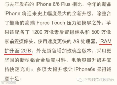 同时也有运营商的通稿文件显示,iPhone 6s/iPhone 6s Plus相比前代在性能上有明显提升,除了配置强劲的A9处理器外,运存升级至2GB也是iPhone 6s彪悍性能表现的主要原因。