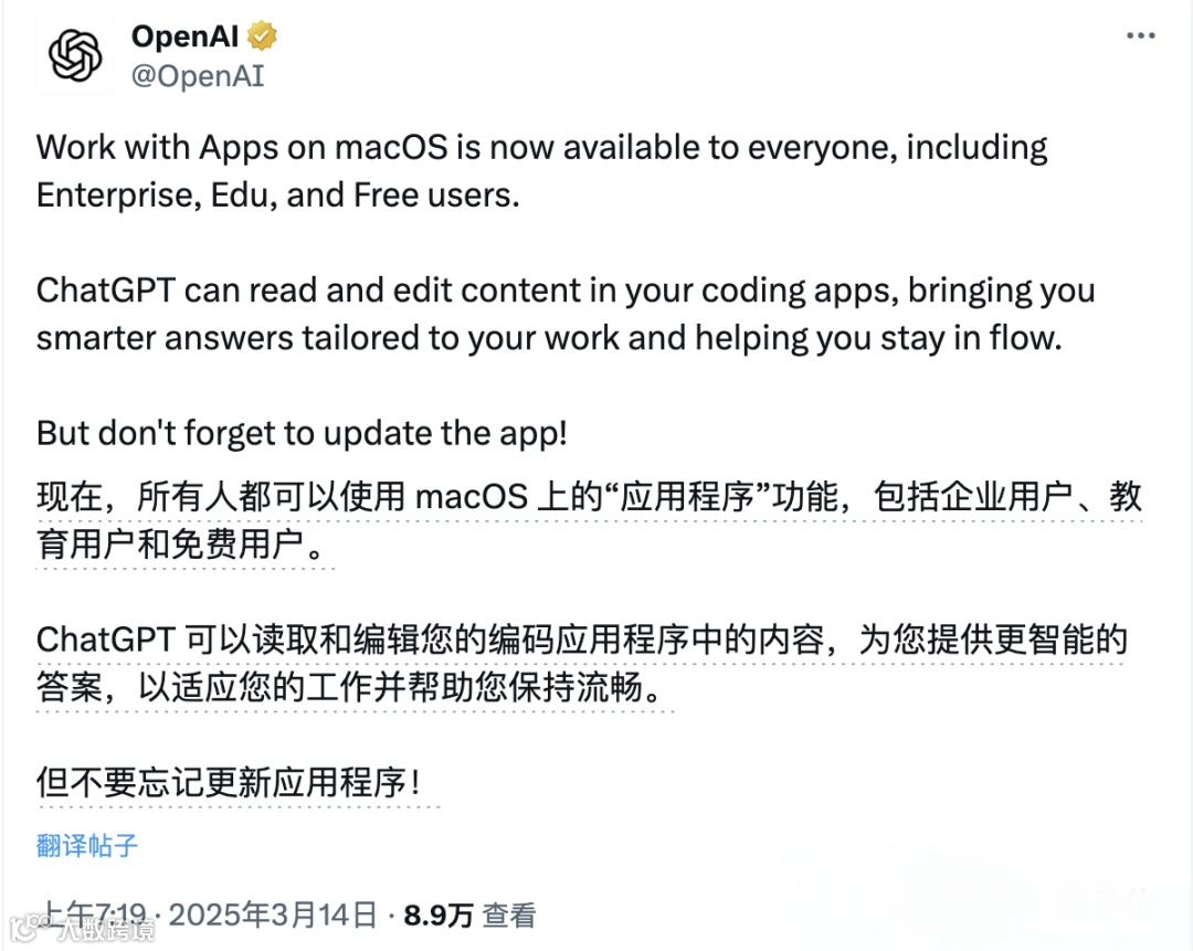 除模型升级外,OpenAI 同步宣布 Mac 客户端专属的Work with Apps 功能向所有用户开放。该功能允许直接从文本编辑器、IDE 等工具读取代码及数据,避免了繁琐的复制粘贴流程,尤其适合编程与数据分析场景。这一举措进一步强化了 ChatGPT 作为 “AI 开发助手” 的定位。