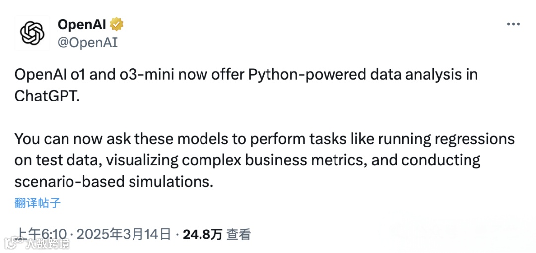 o1 与 o3-mini 对 Python 的支持,不仅是技术迭代,更是 AI 与专业工具融合的里程碑。从单纯的 “问答助理” 到数据分析 Copilot,ChatGPT 正逐步渗透到科研、金融、交通等领域的核心环节。尽管可视化细节与跨平台兼容性仍有提升空间,但此次更新无疑为 AI 辅助决策打开了新的想象空间。未来,随着模型推理能力与工具生态的持续完善,AI 或将成为人类处理复杂数据的 “第二大脑”。