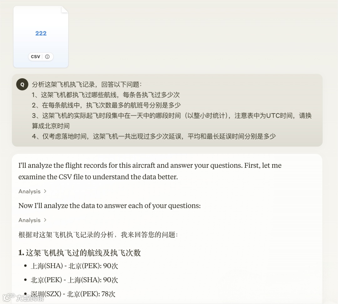在核心数据分析测试中,团队提供了某航班近一年的 400 余条飞行记录,包含四大核心问题:航线统计、高频航班识别、起飞时段分析(UTC 转北京时间)以及延误统计。o1 的表现堪称惊艳:通过 Python 脚本,它不仅准确完成了航线频次统计,还在高频航班分析中实现了数据分组与二次计算。针对起飞时段问题,o1 自动提取 UTC 时间并转换为北京时间,最终锁定上午 10 点至下午 2 点为高峰时段。最复杂的延误计算中,模型成功解析混杂文本中的时间数据,得出延误 32 次、平均延误 45 分钟、最长延误 2 小时的结论。相比之下,4o 虽然答对问题,但输出格式较为粗糙;Claude 则因文件名含中文一度 “罢工”,重试后竟编造数据,直到文件名调整后才恢复正常,暴露了其在非结构化数据处理中的脆弱性。