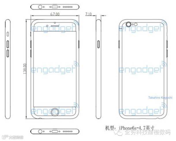 2015年7月外媒曝光的iPhone 6S机身设计图,并称该机将拥有更大的电池容量,机身比iPhone6厚一点,Force Touch将整合进iPhone中。
