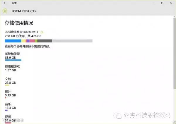该功能不仅可以显示不同分类的文件磁盘占比,甚至还可以显示休眠文件和系统恢复文件占了多大空间。我们可以在设置 — 系统 — 存储中选择相应的磁盘进行查看。