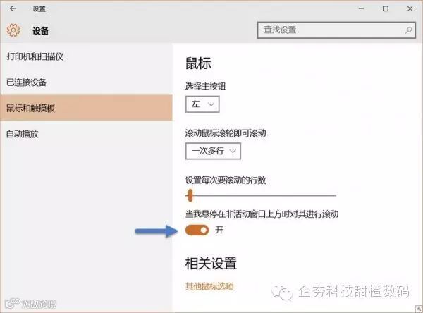 后台滚动功能虽然不是太起眼,但确实是一个非常有用的功能。简单来说,大家在文档编辑器(如Word)进行文档编辑时,经常会通过鼠标滚轮来上下滚动文档内容。那当,在浏览网页时也经常用到鼠标滚动功能。其实这个后台滚动功能意思就是:当程序处于非活动窗口时,也可进行内容的上下滚动。而 Windows 10 将此功能做成了一个开关,我们在设置 — 设备 — 鼠标和触摸板中可以进行打开或关闭。