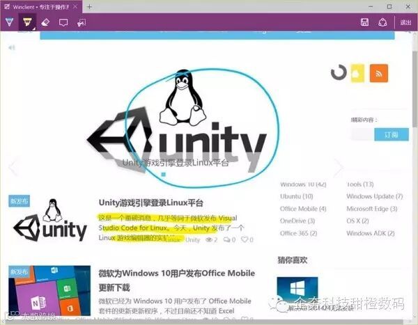 要使用此功能我们只需在 Microsoft Edge 打开网页的同时点击上部的做 Web 笔记图标,Microsoft Edge 会自动帮我们截图,然后我们就可以开始使用标注功能了。该功能与 OneDrive 紧密整合,同时还可以使用 OneNote 进行编辑分享。