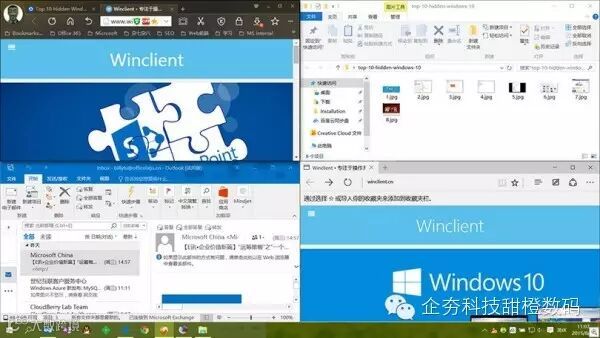 微软从 Windows 7 中开始引入屏幕区域捕捉和窗口对齐功能,而在 Windows 10 提升了多显示设备的捕捉和窗口对齐能力。Windows 10 可以捕获某个应用窗口并在单个显示器上同时显示 4 个应用窗口。