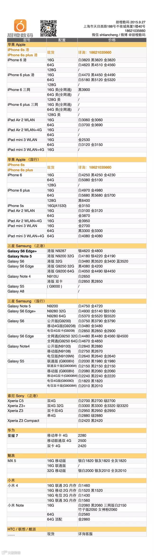 iPhone 6s 及 6s plus 供货逐渐跟上,加价也逐步走低,但小幅波动仍然不断,报价单仅供参考,大家可以随时拨打 18621035660 咨询实时报价;受 6s 影响,iPhone 6 及 plus 的价格也有所走低,今日小降 20-50 元;安卓各款稳定。
